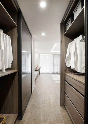 私區一共規劃三間臥室,都選用柔和色系做鋪陳,三間房的空間開闊度大,設計師捨棄做過多的人造光堆疊細節,反利用陽光的導入及床頭不同木飾板設計,以清新的柔光之境,呈現出簡約且充滿細節的低調質感。